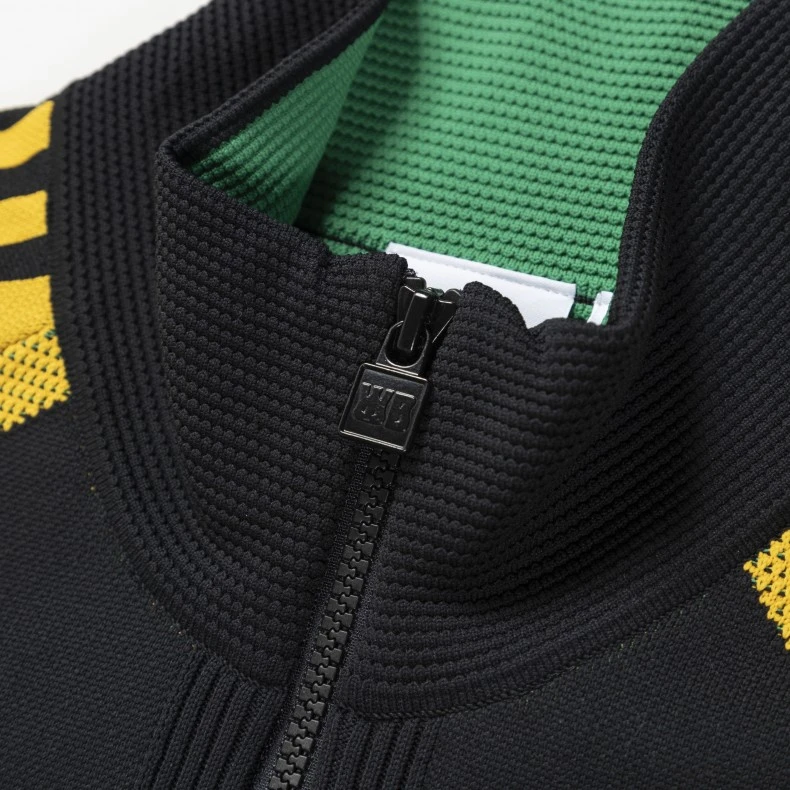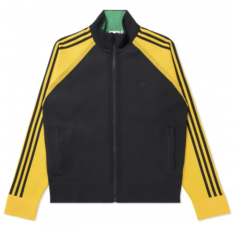 The Knit Jacket, crafted from 100% recycled polyester knit, is issued in the iconic contrast of black and gold.