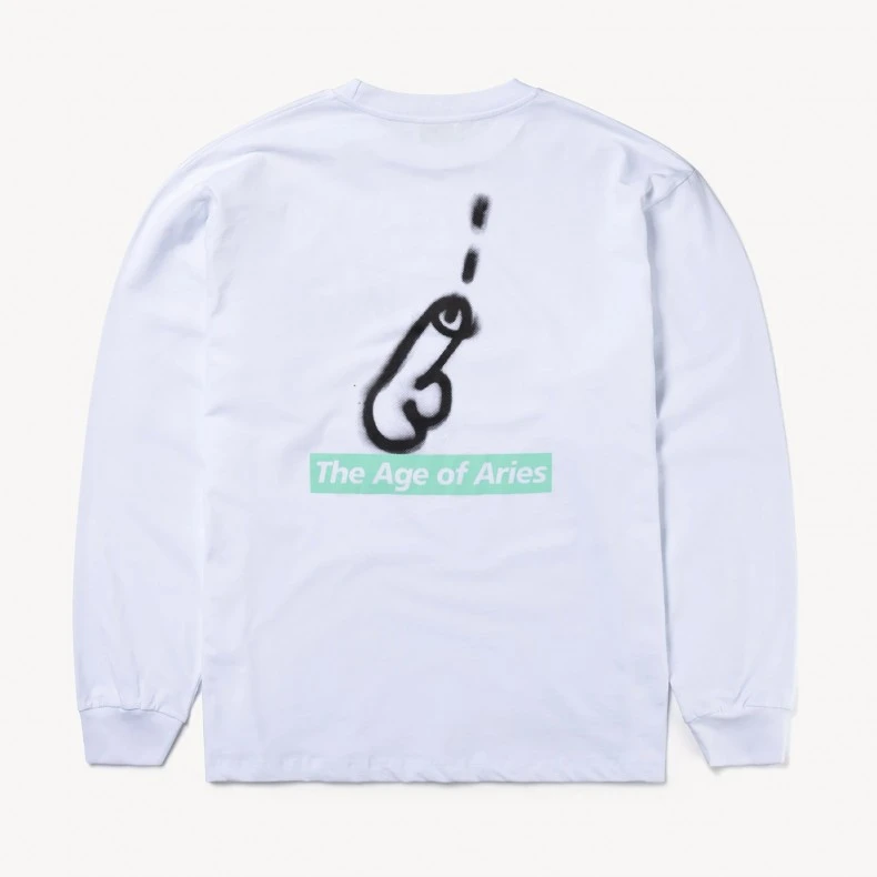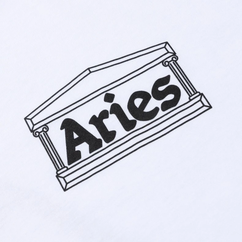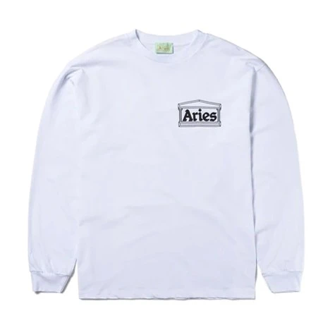 Regular fit unisex Aries Age of Aries Long Sleeve T-Shirt; in a white mid-weight cotton jersey, with a ribbed neck, set-in sleeves, ribbed cuffs, straight hem, featuring a black Aries Arise temple screen-printed graphic chest print & large black & teal back print.