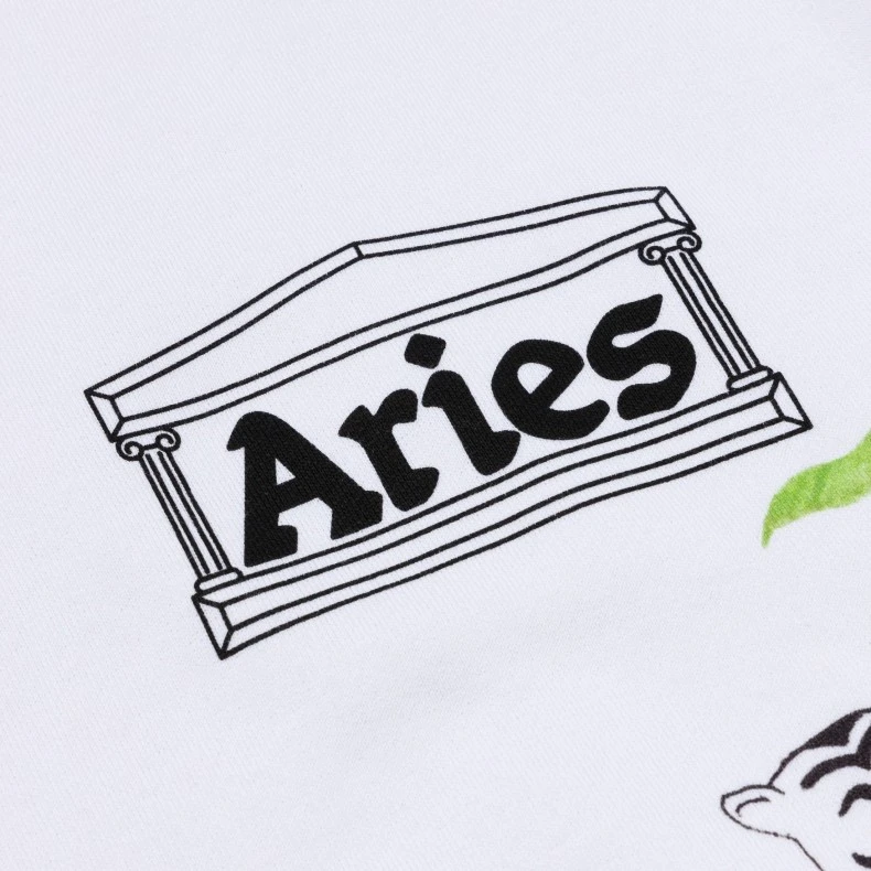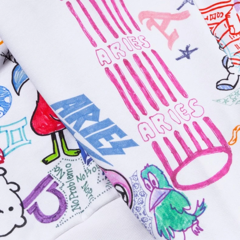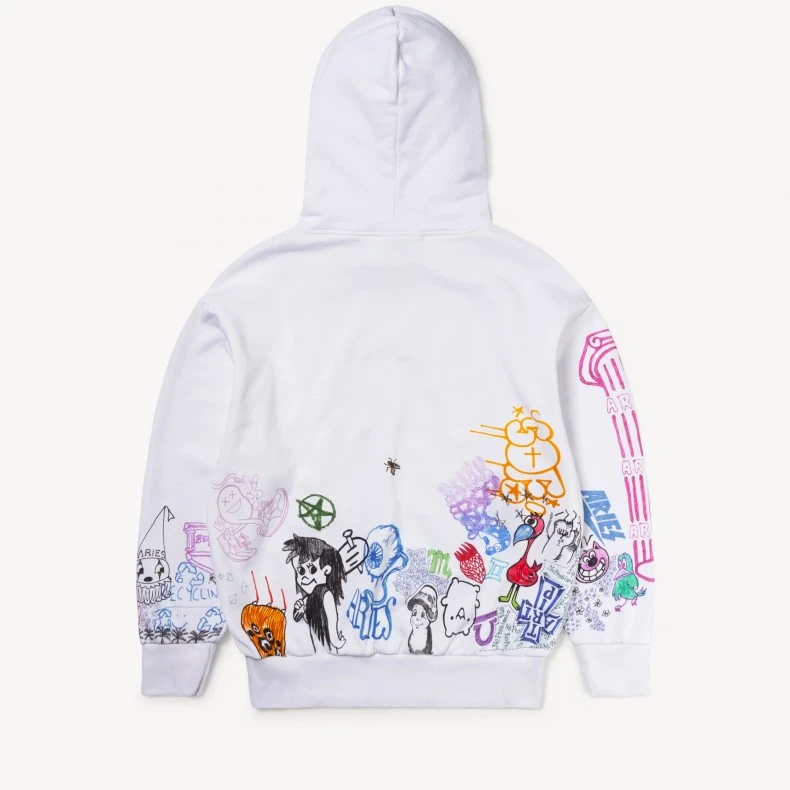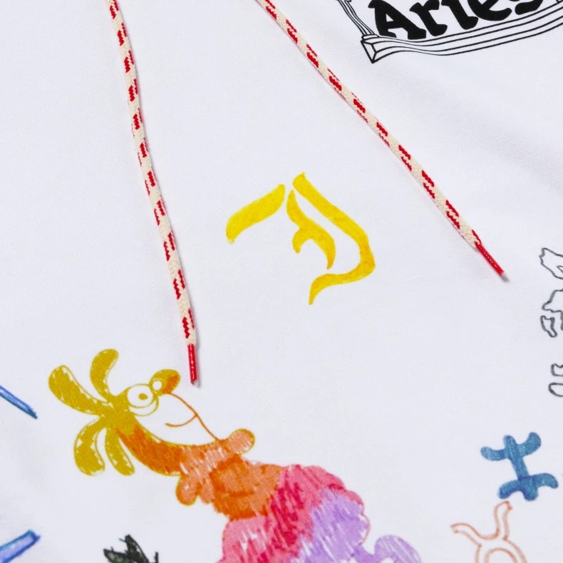 Regular fit unisex Aries Arise Doodle Pullover Hoodie; in a white fleece back cotton brushed-back jersey, with a jersey-lined hood, white & red patterned cord adjuster, set-in sleeves, and featuring multi-coloured Aries doodles on the front, back, and sleeves and completed with an Aries temple screen-printed logo on the chest.