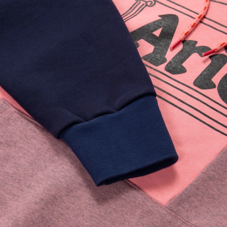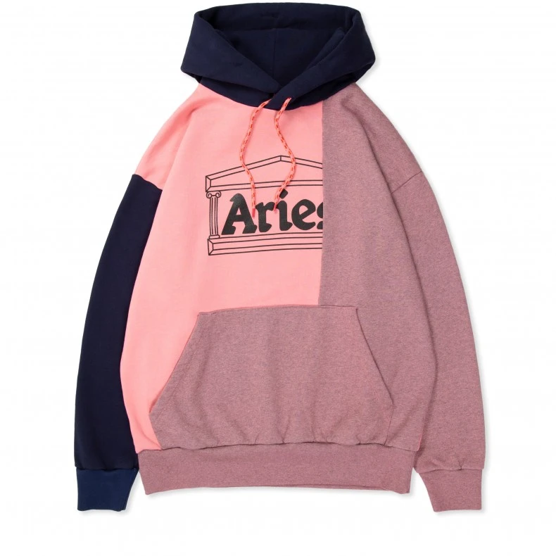 Regular fit unisex Aries OD Colourblock Pullover Hooded Sweatshirt; in a pink fleece back cotton jersey, with a jersey-lined hood and patterned cord adjuster, set-in sleeves, and featuring a black Aries Temple chest graphic print.