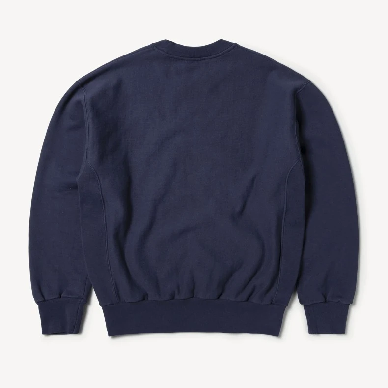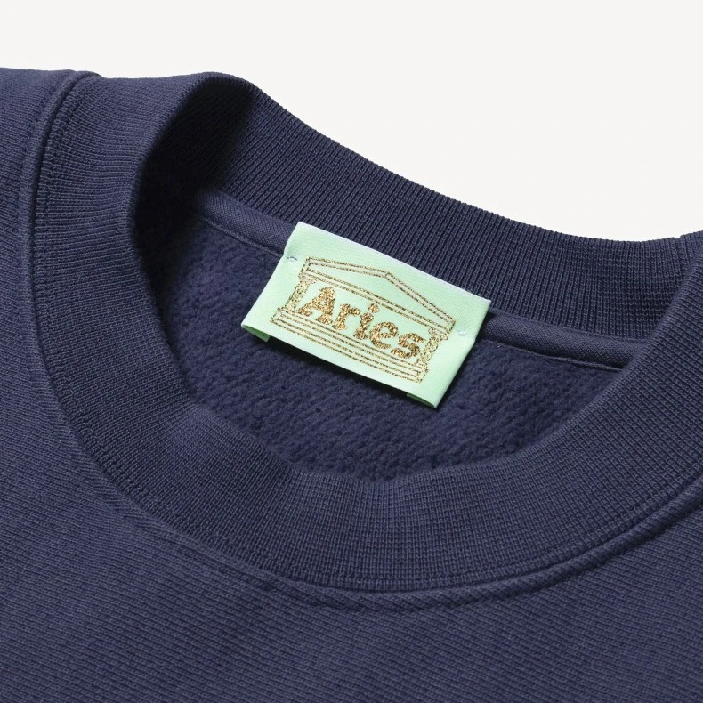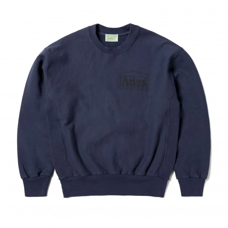 Boxy fit unisex Aries Premium Temple cross-grain Crew Neck Sweatshirt; in a dark navy blue heavy brushed back jersey fleece, with a ribbed neck, waist and cuffs, set-in sleeves, straight hem, sporty rib panel detailing on both sides, and featuring a screen printed black Aries Arise Temple logo chest print.