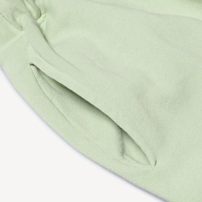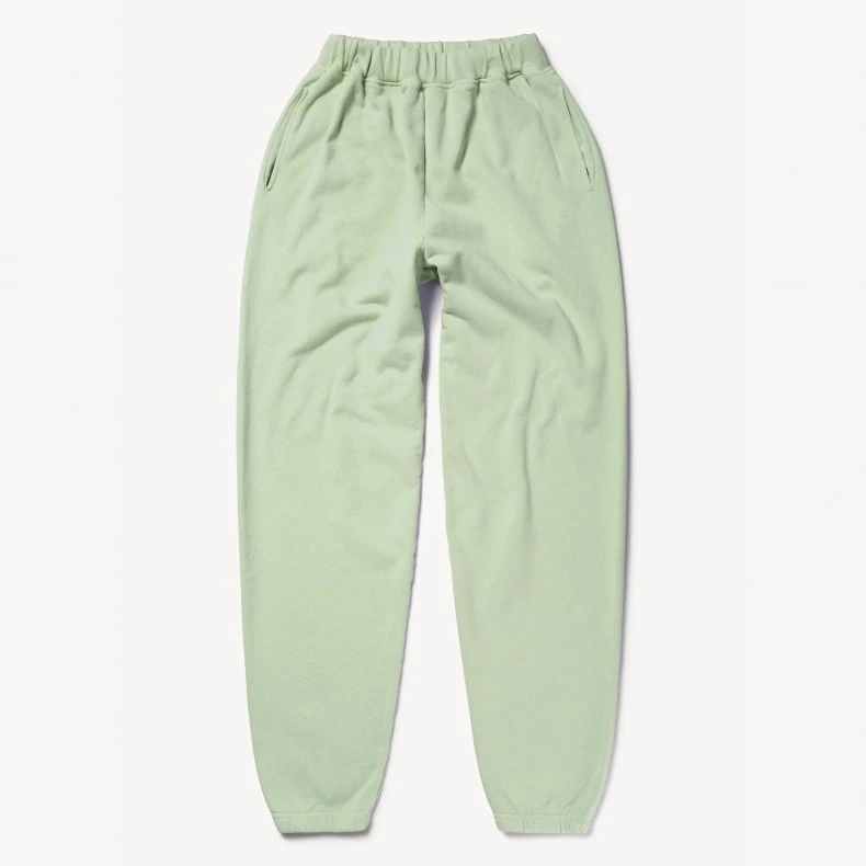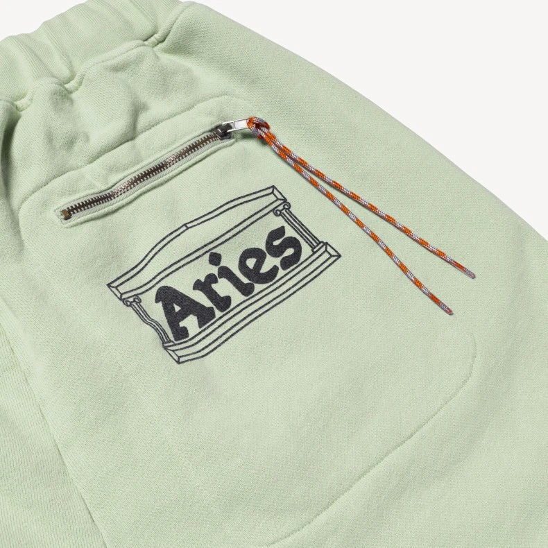 Unisex Loose fit Aries cross-grain Sweatpant in a pastel light green heavy brushed-back jersey fleece, with elastic rib waist and leg openings, and featuring a black screen-printed logo on the back zip pocket