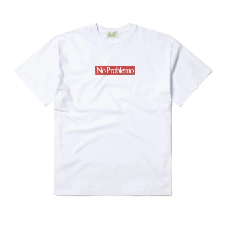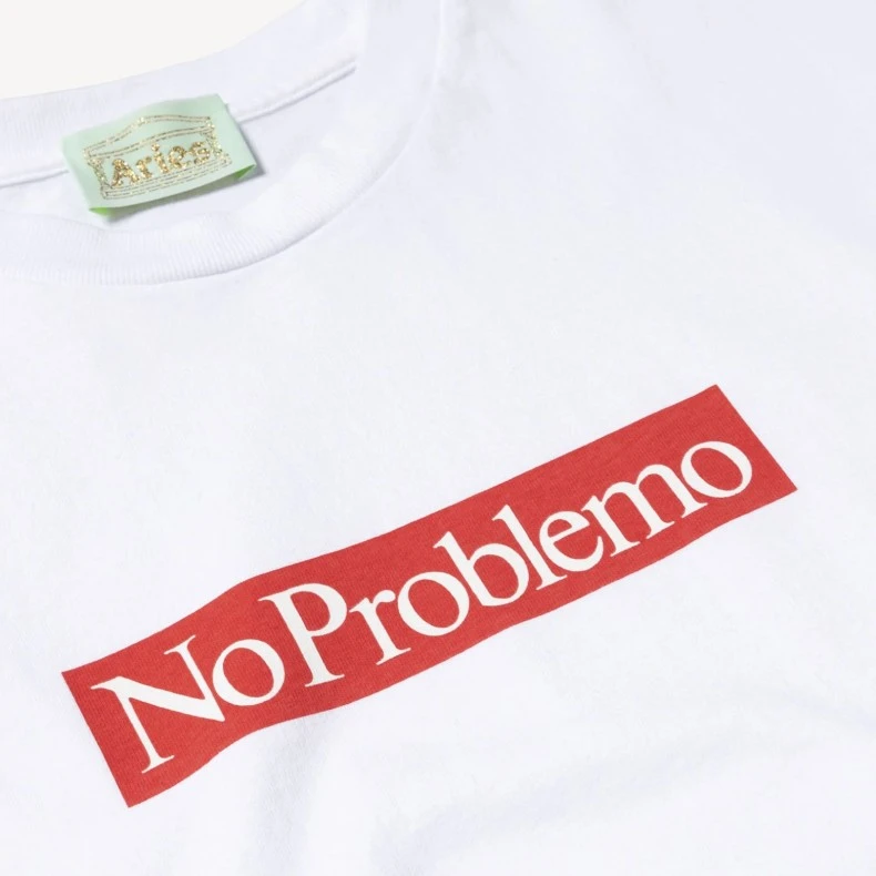 Regular fit unisex Aries No Problemo Supremo Tee; in a white heavy-weight premium cotton jersey, with a ribbed neck, set-in sleeves, straight hem, and featuring an Aries red box logo chest print.