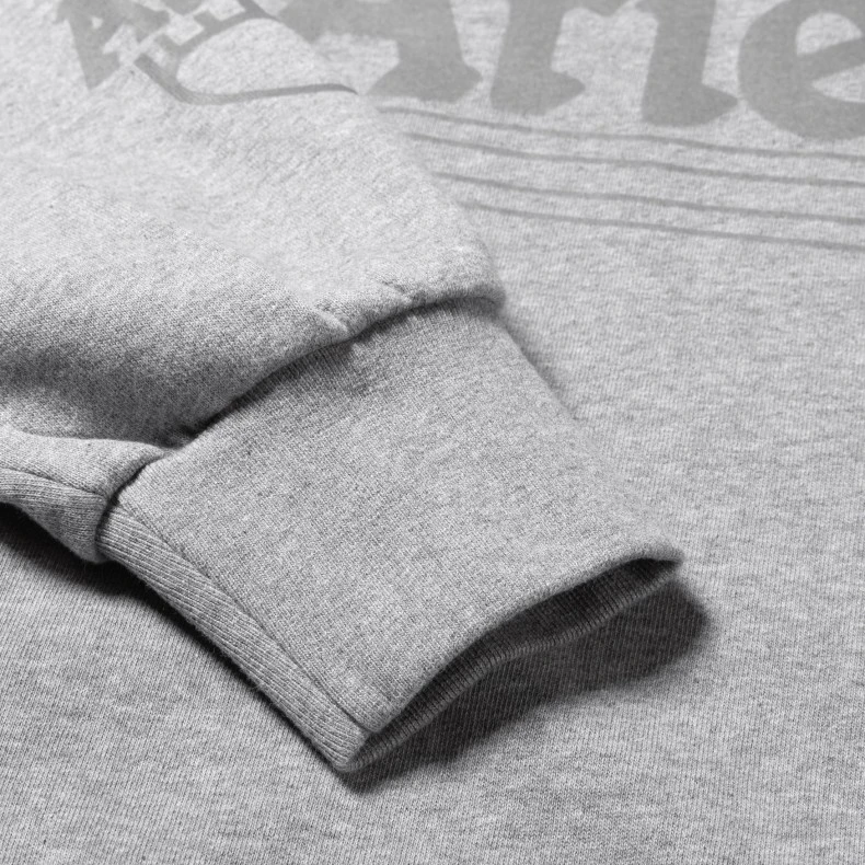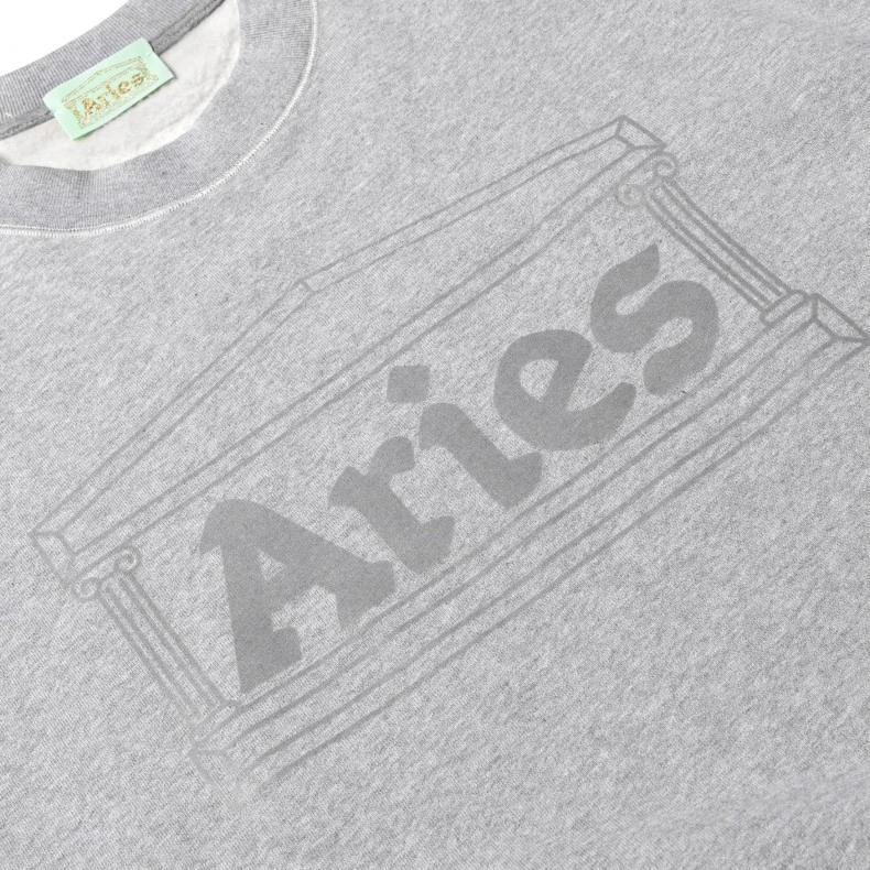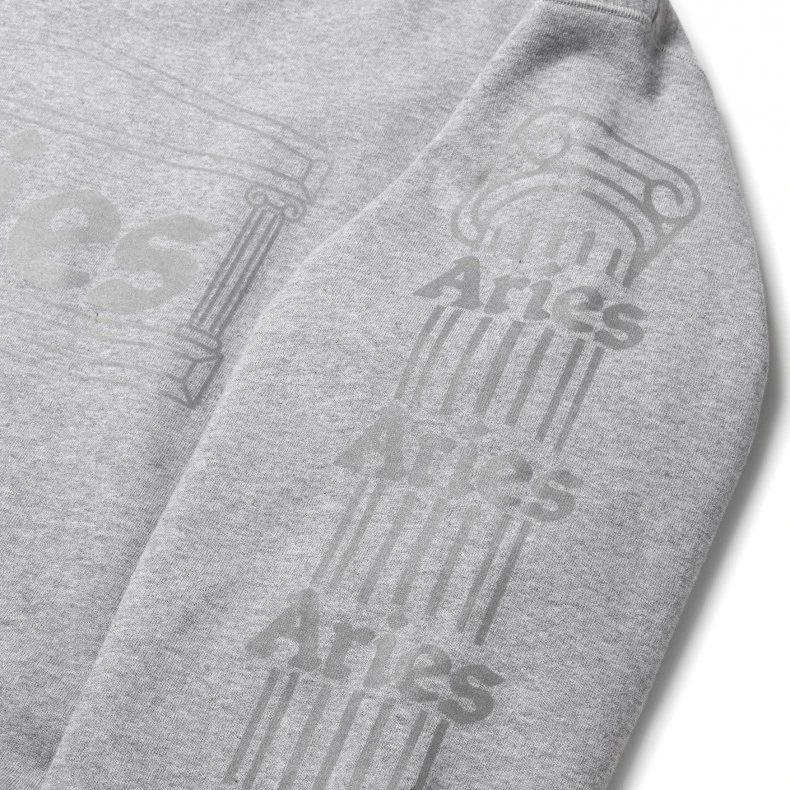 Boxy fit unisex Aries Column Crew Neck Sweatshirt; in a grey heather cotton soft jersey, with a ribbed neck, waist and cuffs, set-in sleeves, straight hem and featuring a reflective Aries Arise Temple logo chest print and Aries Arise Column sleeve prints.