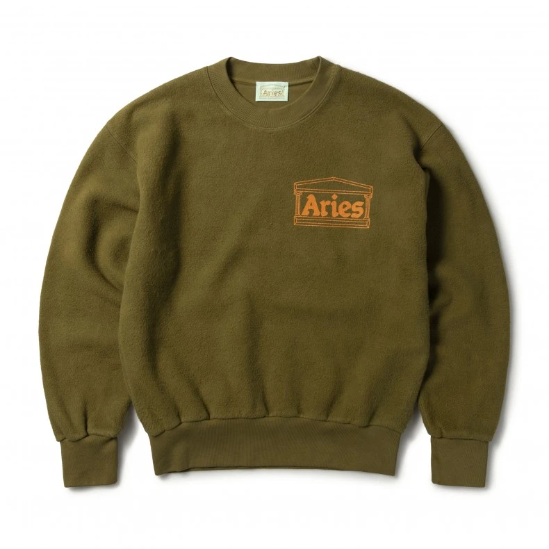 Unisex crew-neck sweatshirt made from brushed jersey fleece. Brushed-side out, with a screen-printed Aries temple logo on the chest.