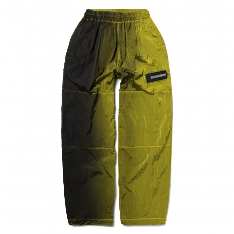 Unisex track-pant made in a lightweight nylon fabric. With an elasticated waistband, adjustable ankle toggles, reinforced knees, and a zip patch pocket on the back. With vintage flat-lock stitch detailing and a silicone brand patch. Finished with a two-colour ombre spray-dye treatment.