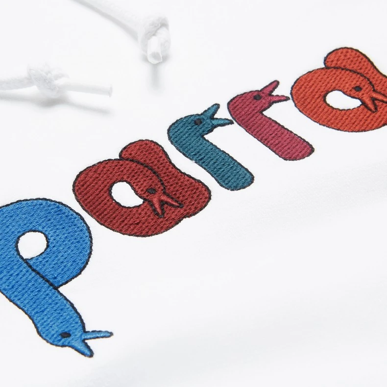 Regular fit men’s by Parra Bird Face Font Pullover Hooded Sweatshirt; in a white cotton fleece fabrication, with set-in sleeves, ribbed cuffs and waist, adjustable hood cords, and featuring a large bird face embroidered application.