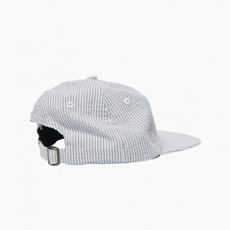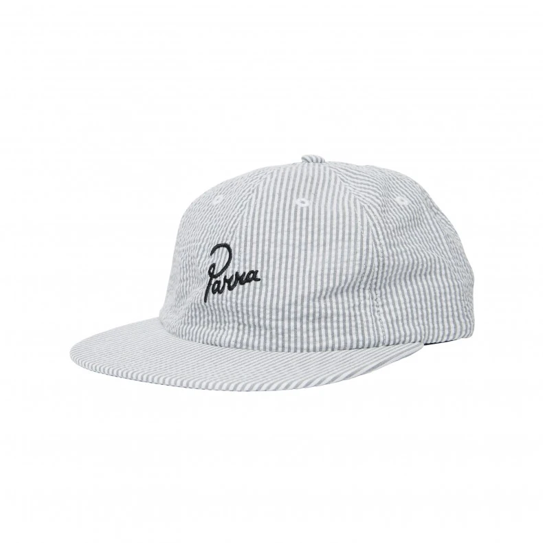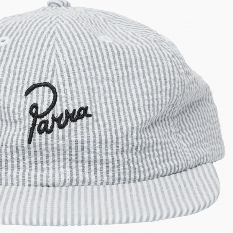 by Parra Classic Logo 6 Panel Baseball Cap; in white & light grey seersucker stripes with a black embroidered classic logo.