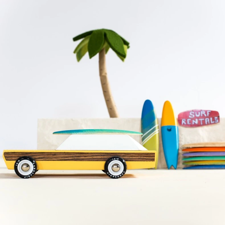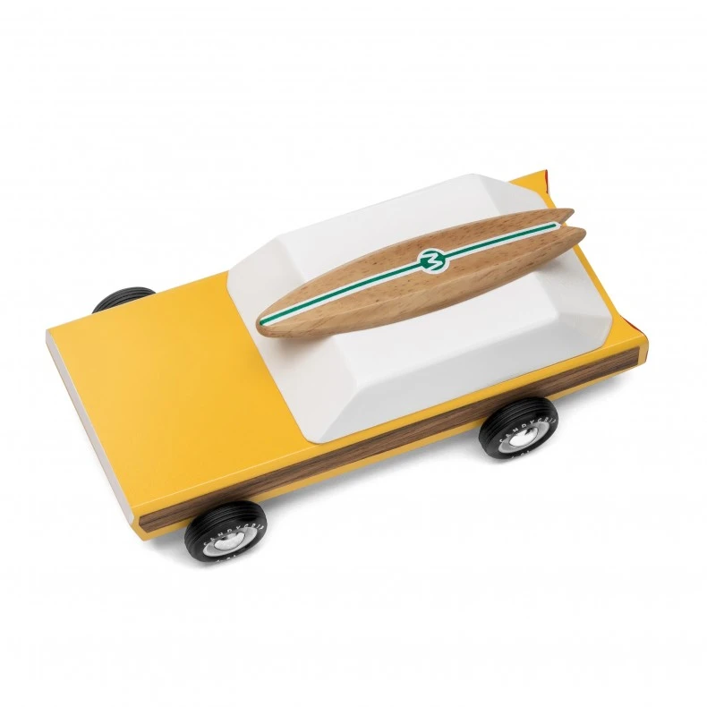 The most classic of the classics, this is what legends are made of. With real walnut veneer-panelled sides and a magnet embedded in the roof, it comes with a surfboard that snaps onto it. This car also features a magnetic tow hook—allowing it to hitch their equally awesome trailer.