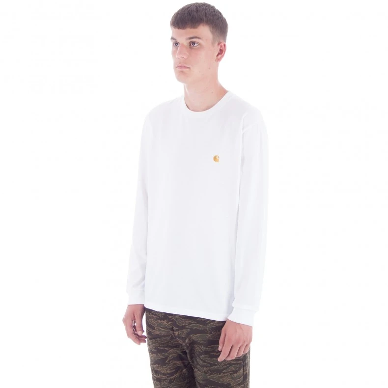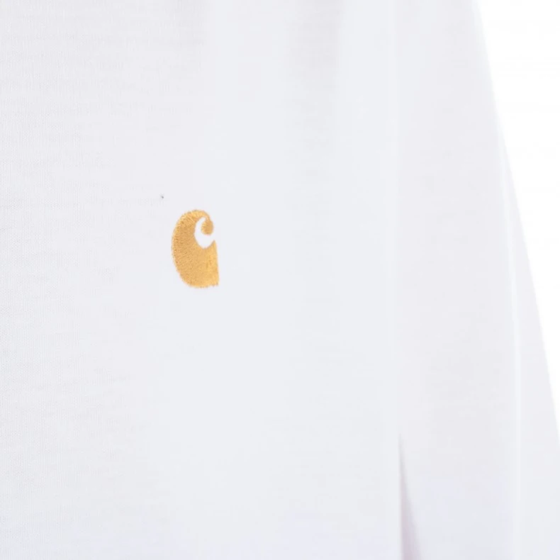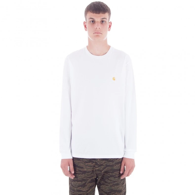 Regular fit men’s Carhartt WIP Chase Long Sleeve T-Shirt in a White midweight cotton jersey, with a ribbed neck, set-in sleeves, ribbed cuffs, straight hem; and featuring a Gold Carhartt WIP Chase embroidered logo on the left side of the chest.