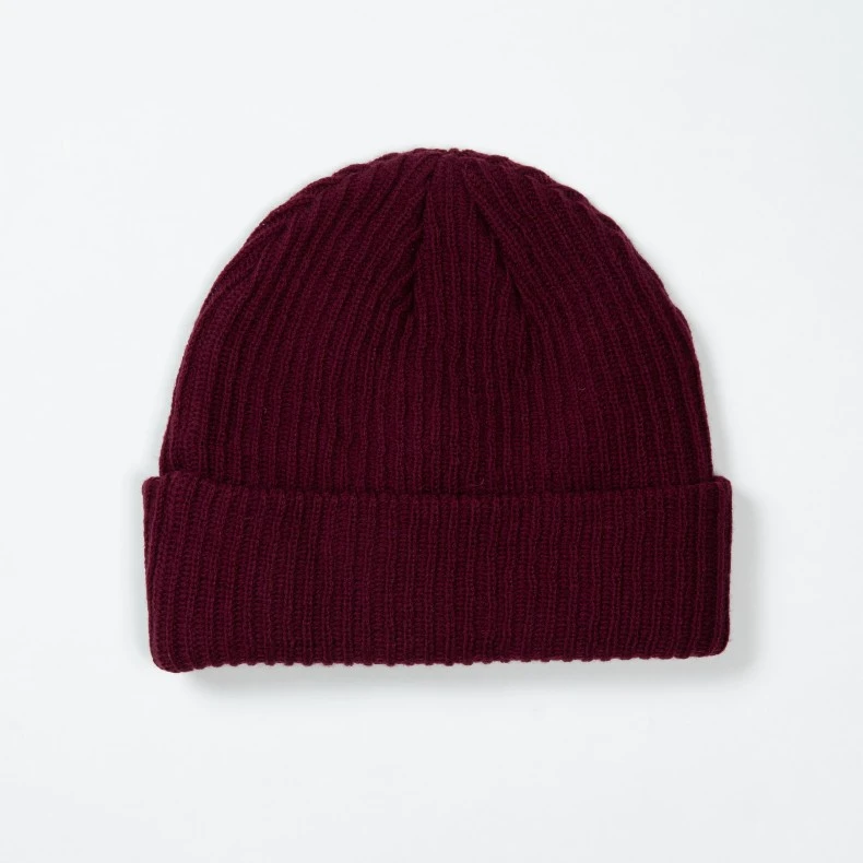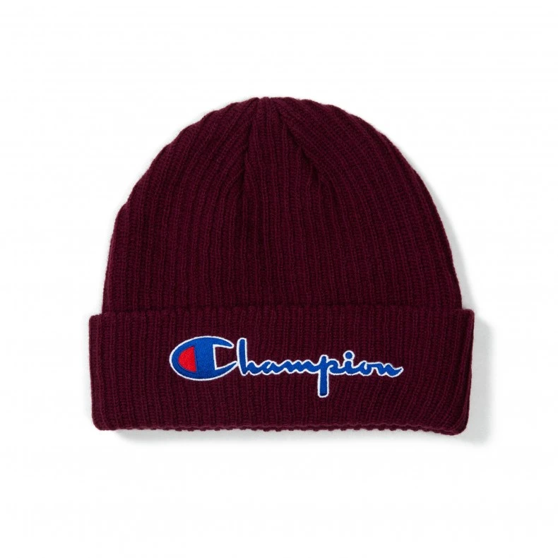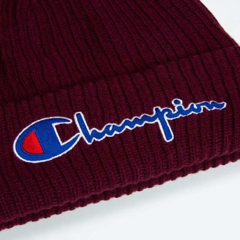 Champion Reverse Weave Script Applique Beanie, in a burgundy double layer merino wool, reverse weave ribbed knit, and featuring a Champion Script Logo cuff embroidery.