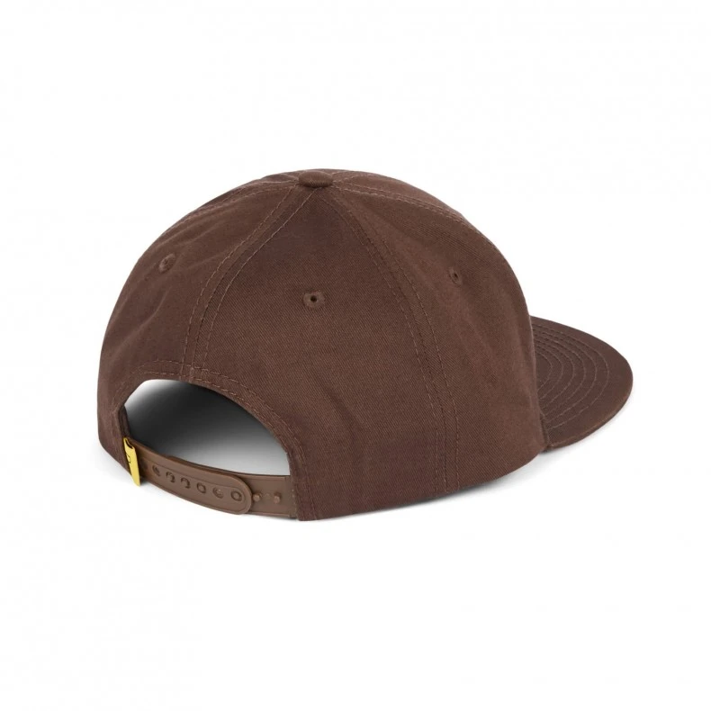 Dime Basketbowl Cap; in brown twill cotton, with a rear snapback closure, embroidered eyelets, and featuring a Dime logo front embroidery and yellow classic logo tab.