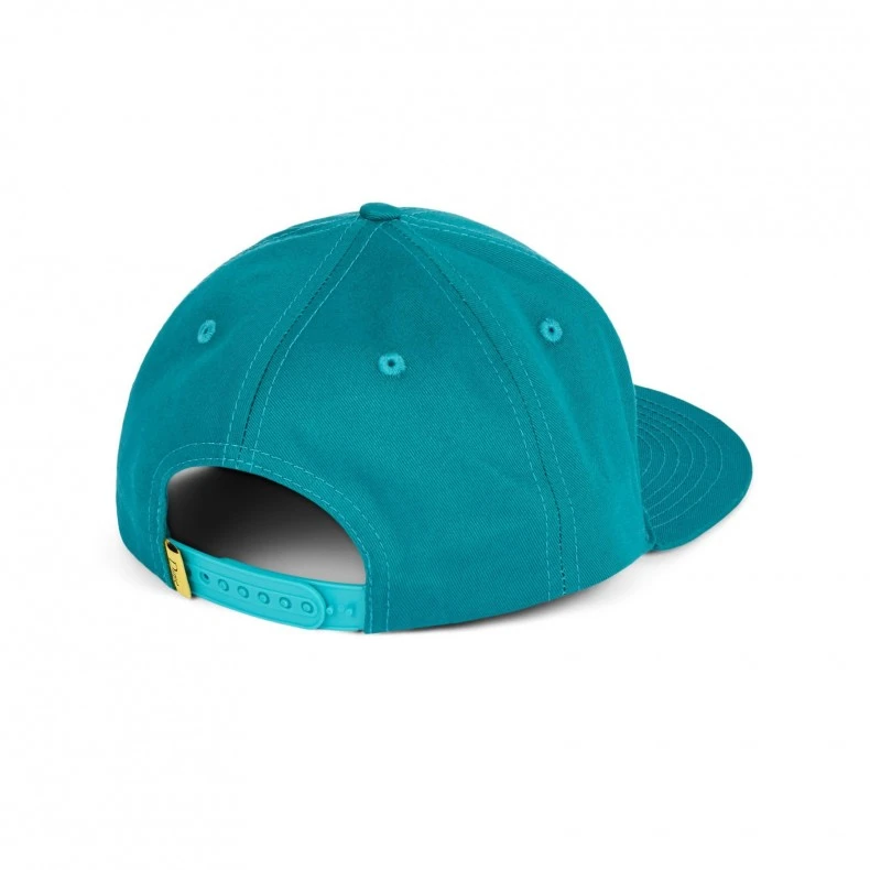 Dime Basketbowl Cap; in teal blue-green twill cotton, with a rear snapback closure, embroidered eyelets, and featuring a Dime logo front embroidery and yellow classic logo tab.
