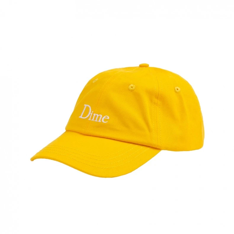 Dime Classic Cap; in yellow cotton, with a rear strap with self-fabric adjustment tab, embroidered eyelets, and featuring a white Dime Classic logo front embroidery and yellow classic logo tab.