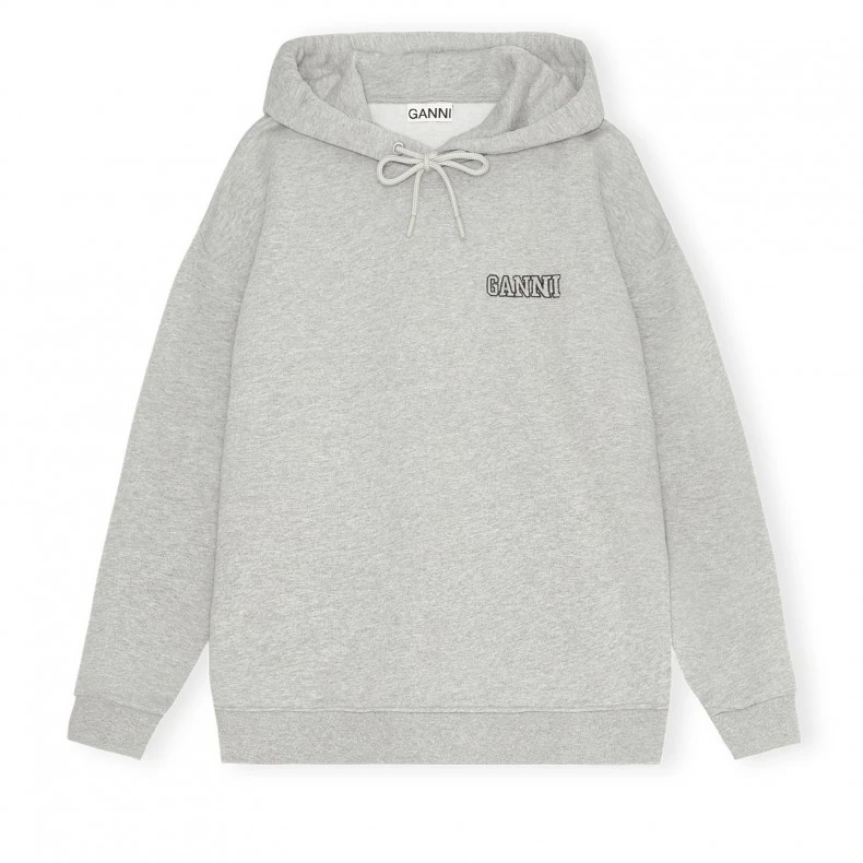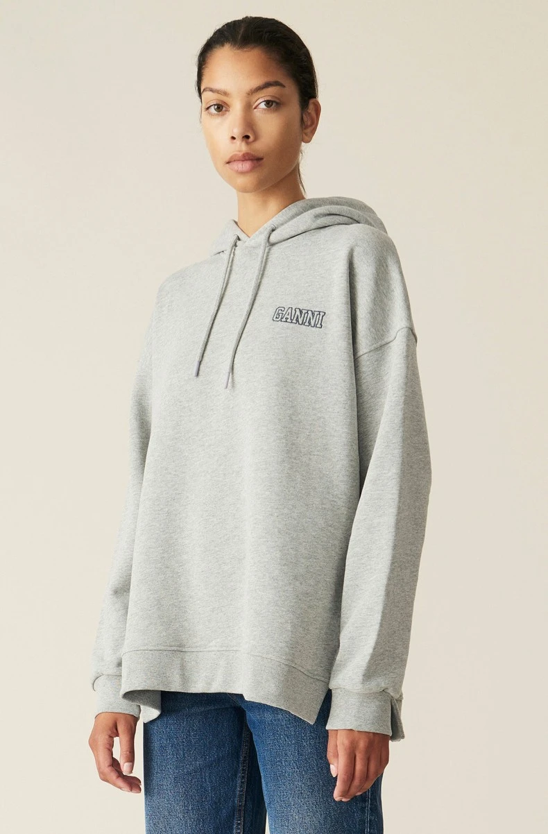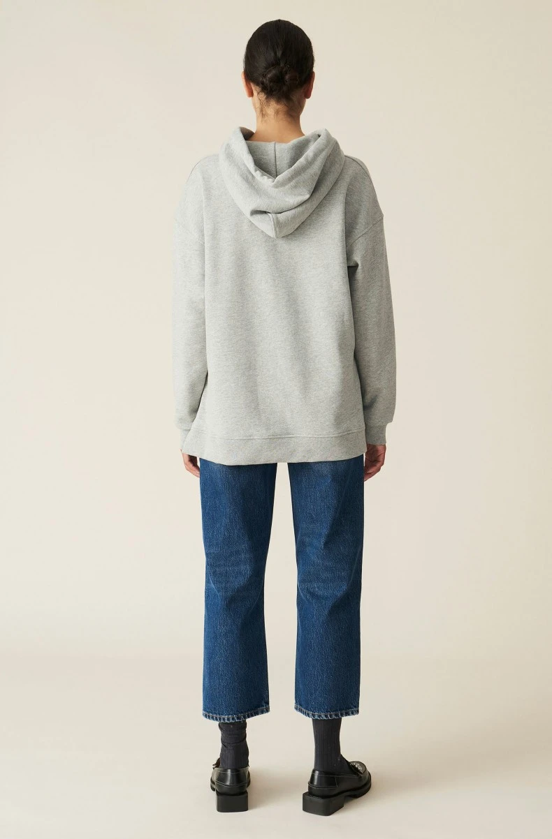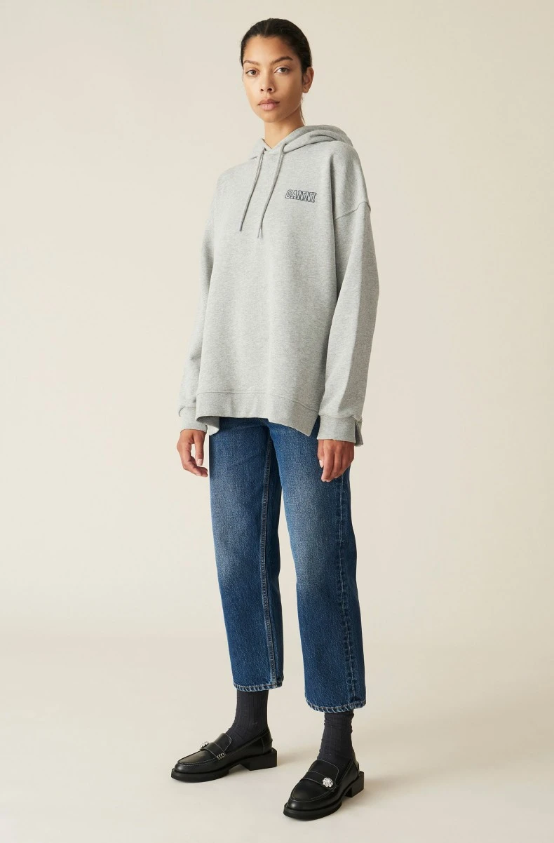 This piece is made of 30% recycled polyester and 70% organic cotton, which significantly lowers the environmental footprint of a garment. Using recycled fibers decreases the demand for virgin fibers, and organic cotton reduces water usage, greenhouse gas emissions, and the amount of chemicals used. GANNI SOFTWARE is traceable on stages 1-3 of the supply chain and every piece is made in Europe.
