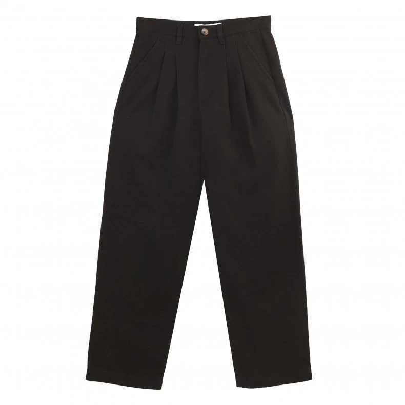 Their bestselling unisex Classic Slacks in black, in a mid-weight brushed cotton drill. Lightly tapered, cropped leg with pleats at the front to add volume. Darts at back form a clean line over the derriere.