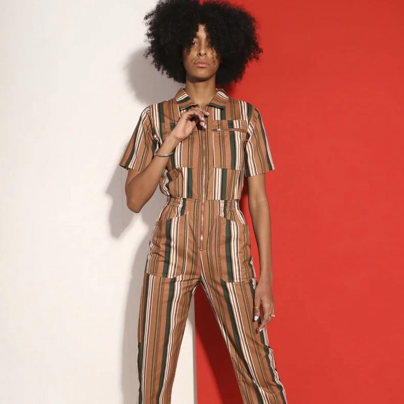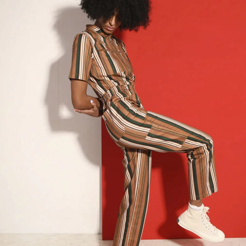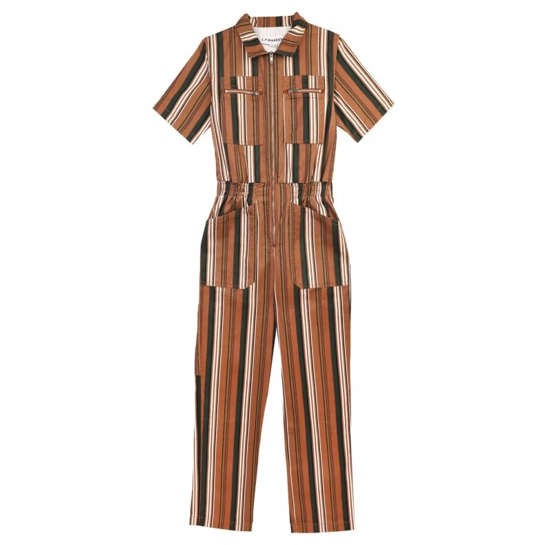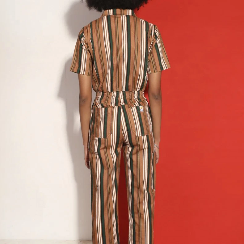 Their popular Danny Boilersuit in a nostalgic 90s Stripe print. With a metal front zip, workwear pocket details, and an elasticated waist for a flattering fit.
