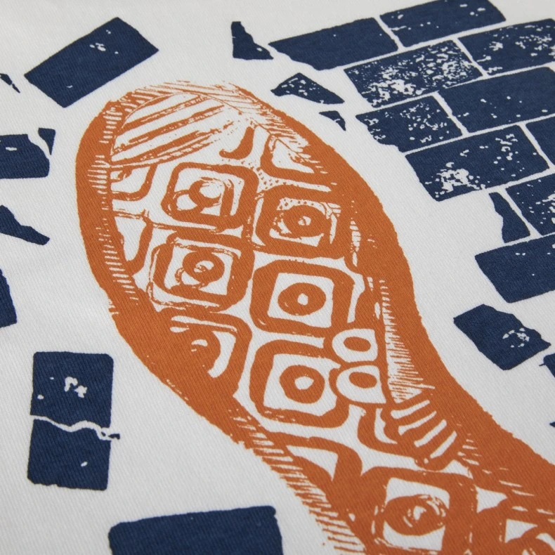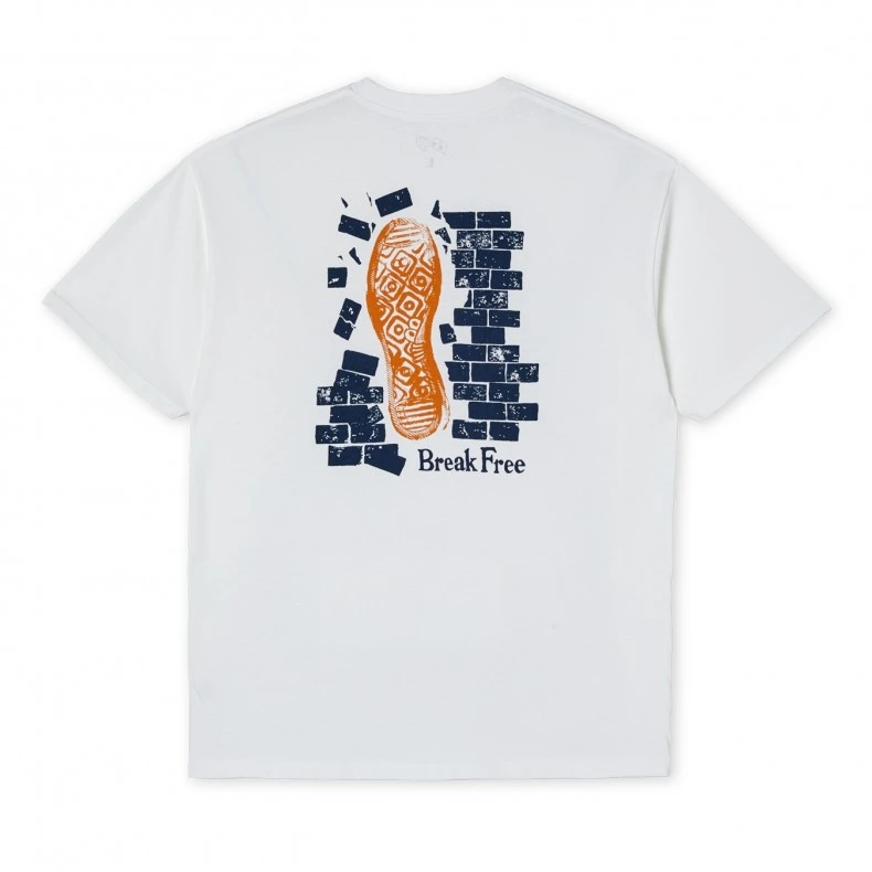 Regular fit men’s Last Resort AB Wall T-Shirt; in a white mid-weight cotton jersey, with a ribbed neck, set-in sleeves, straight hem, and features a navy & orange wall front and a large back print.