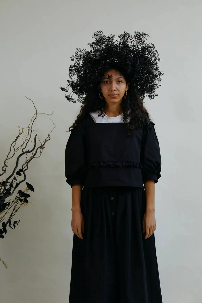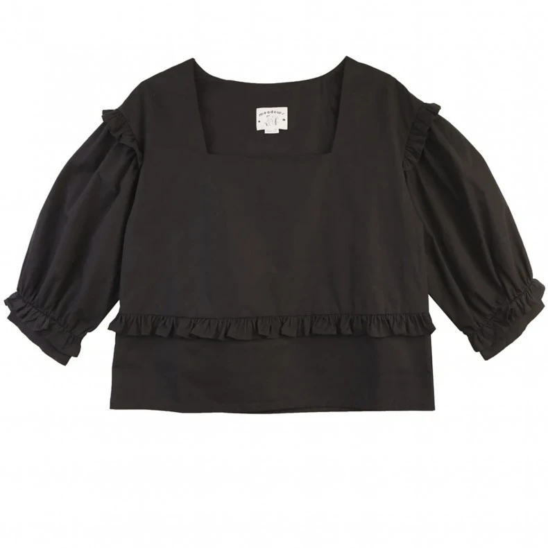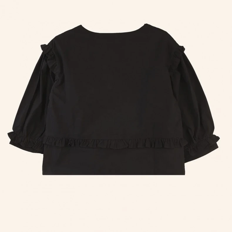 Relaxed fit top, slightly cropped in length with a square neckline. With 3/4 length voluminous sleeves, gathered at the cuff and shoulder. Frill detail on the arms and bodice.