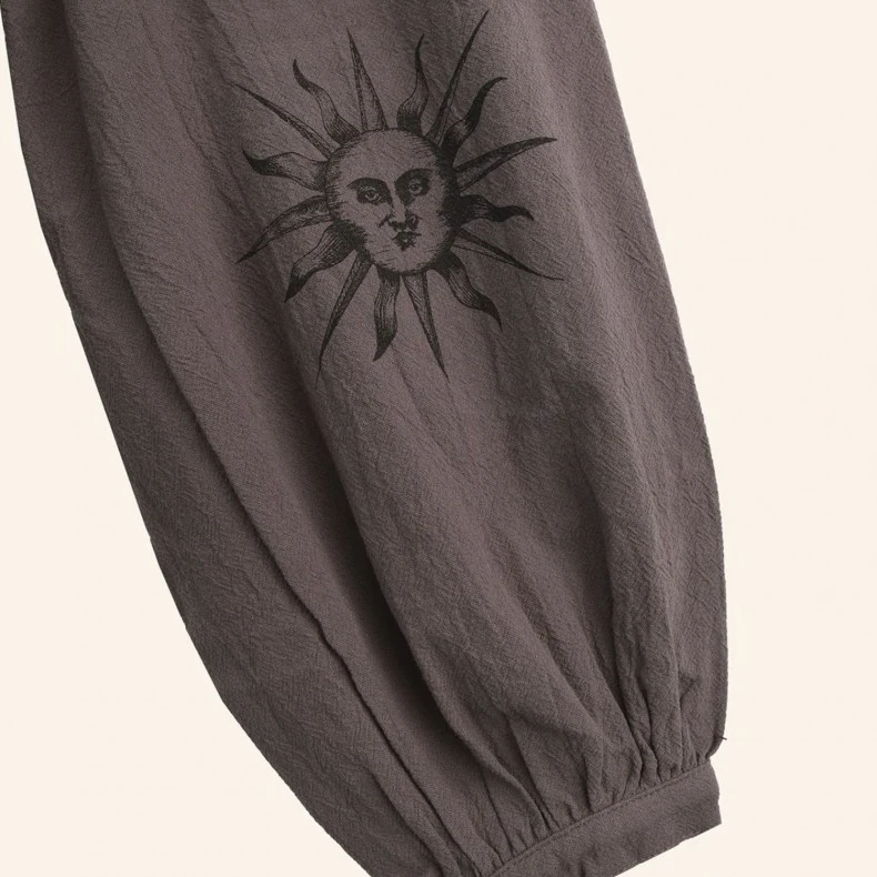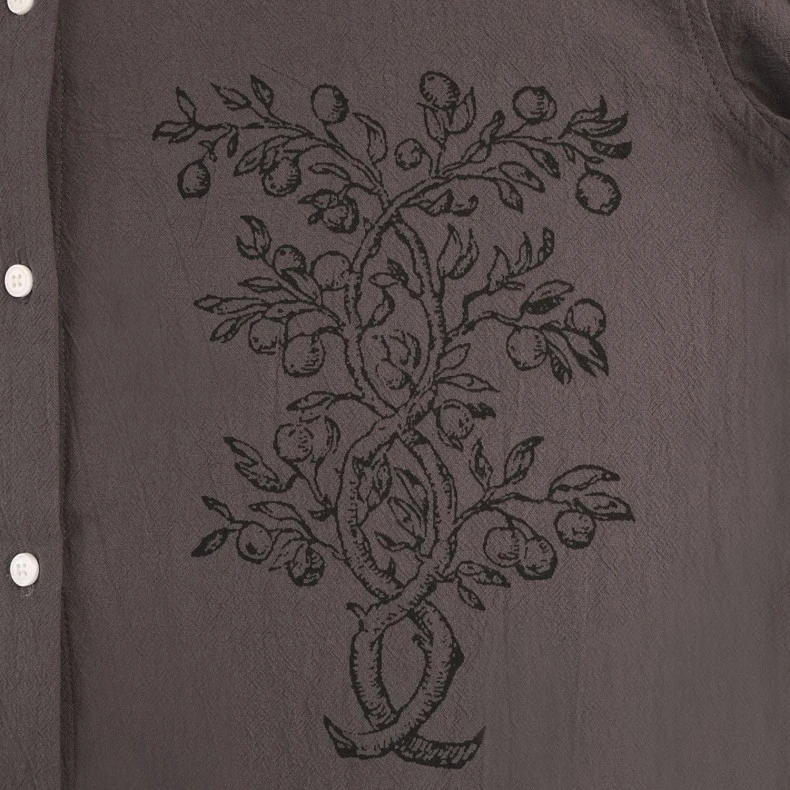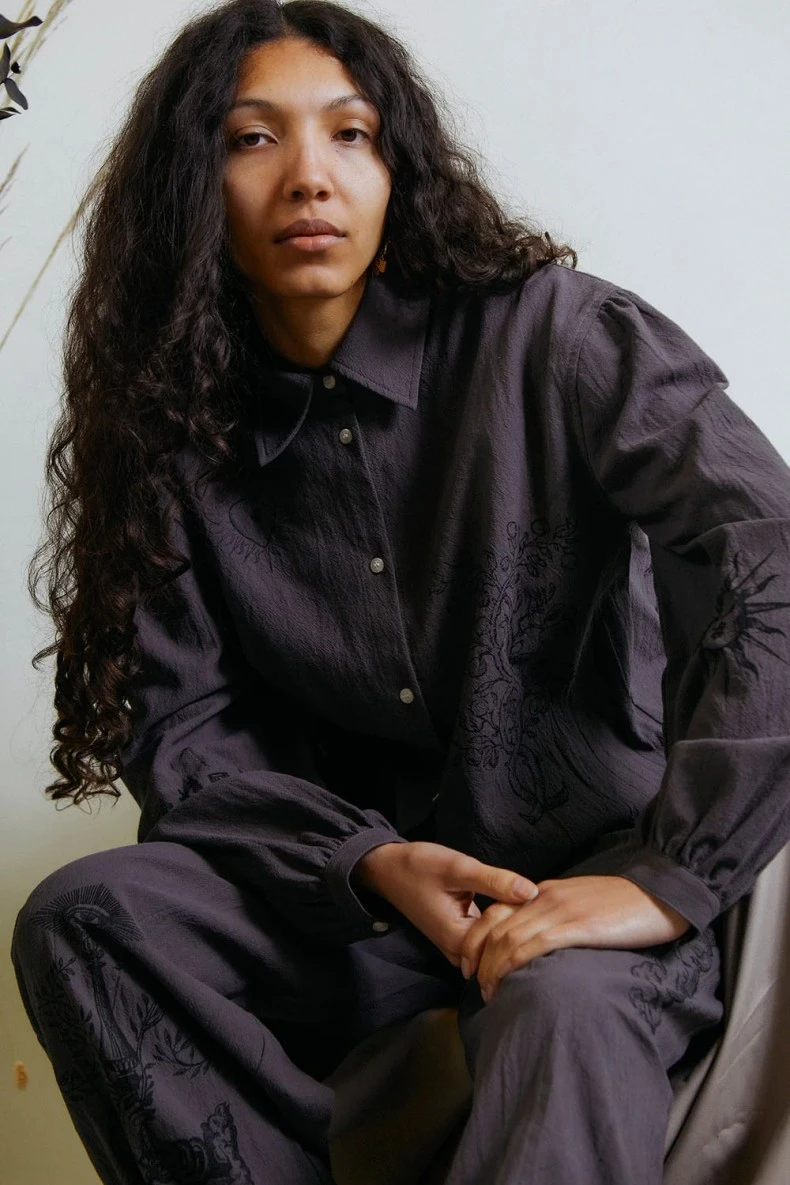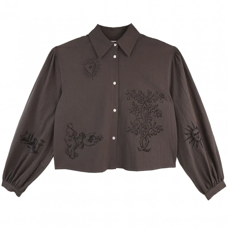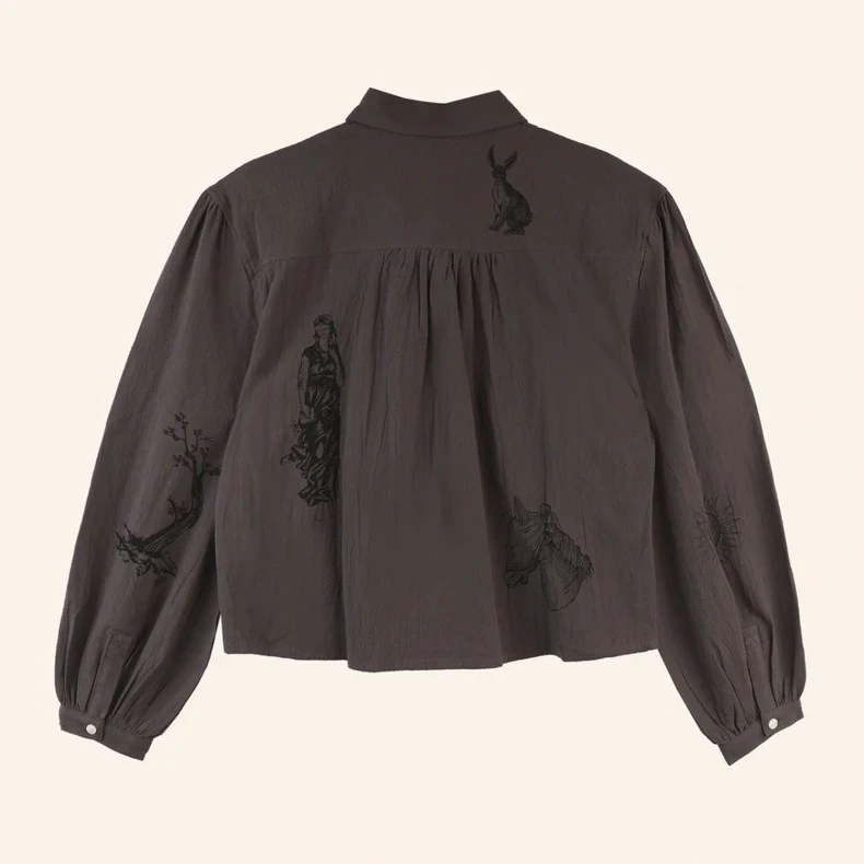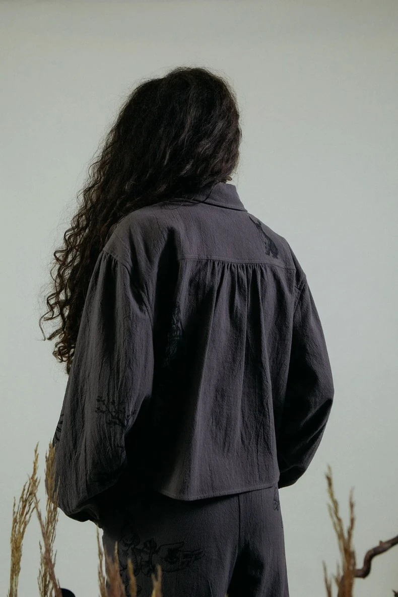 Long sleeve cropped shirt with voluminous sleeves, large collar, and buttons down the front. Each piece is unique with individually printed illustrations throughout. Garment may differ slightly.
