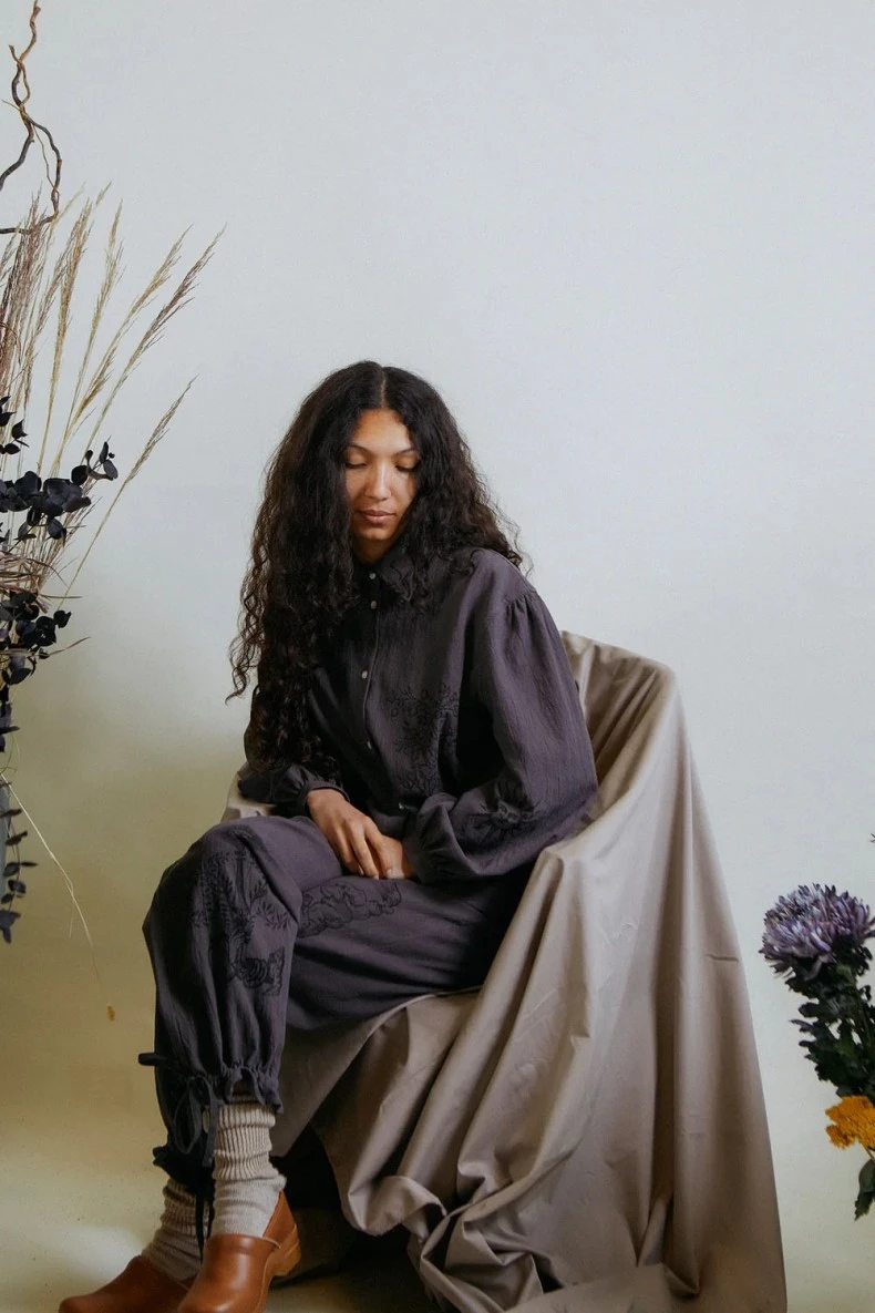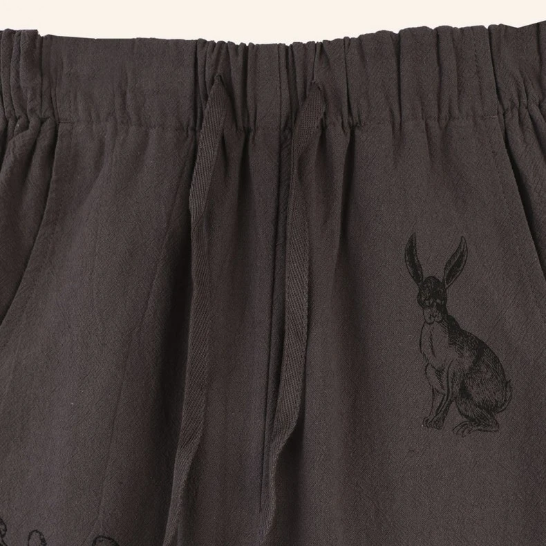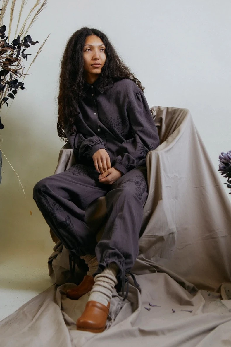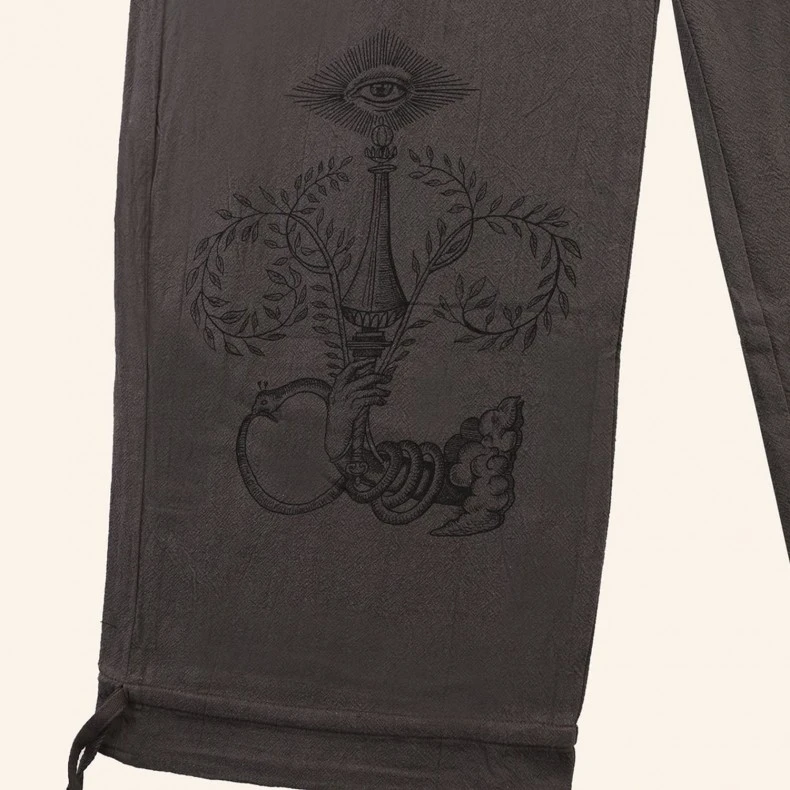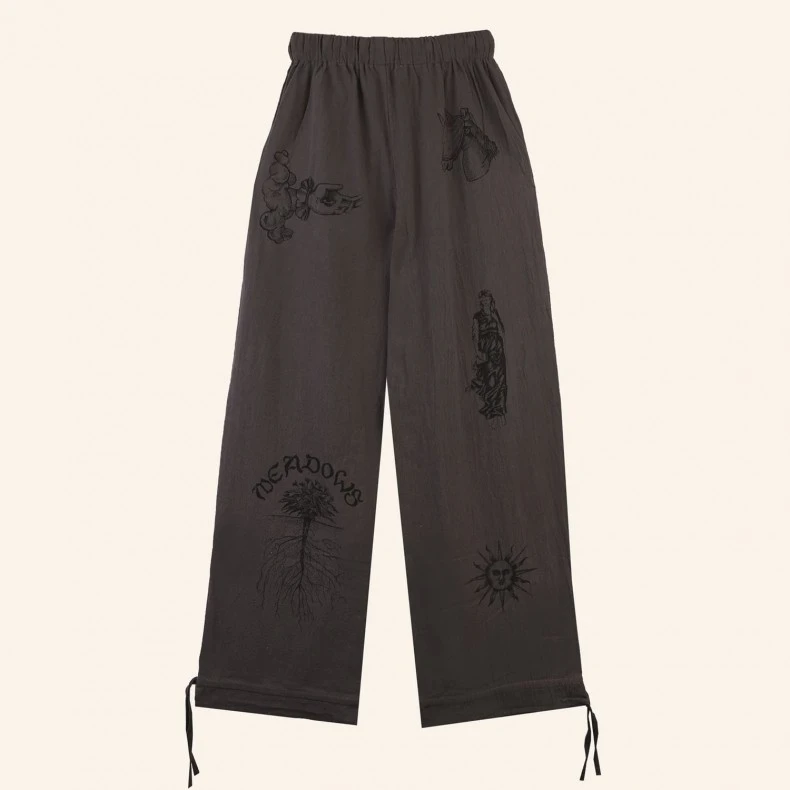 Their Hedera Trouser has a straight cut and adjustable ties at the waist and ankle, with pockets. Illustrations are individually printed throughout, meaning each garment is unique and may differ.