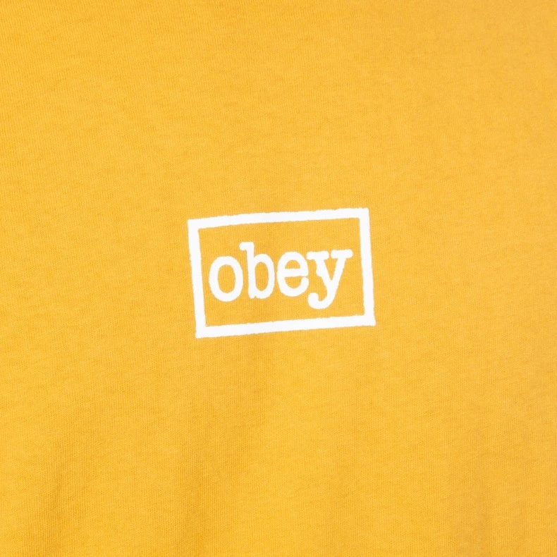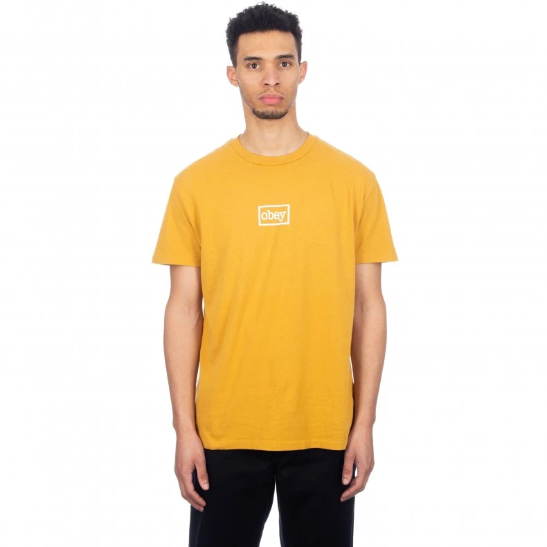 Regular fit men’s Obey Typewriter T-Shirt; in a dusty gold mid-weight cotton jersey, with a ribbed neck, set-in sleeves, straight hem and featuring a white Obey Typewriter chest print.