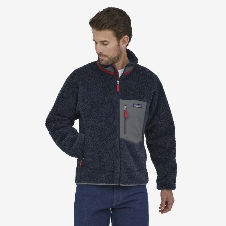 A warm and windproof 100% polyester (50% recycled) bonded sherpa fleece jacket for cool, blustery weather in dark navy blue with grey & red accents. Fair Trade Certifiedâ„¢ sewn.