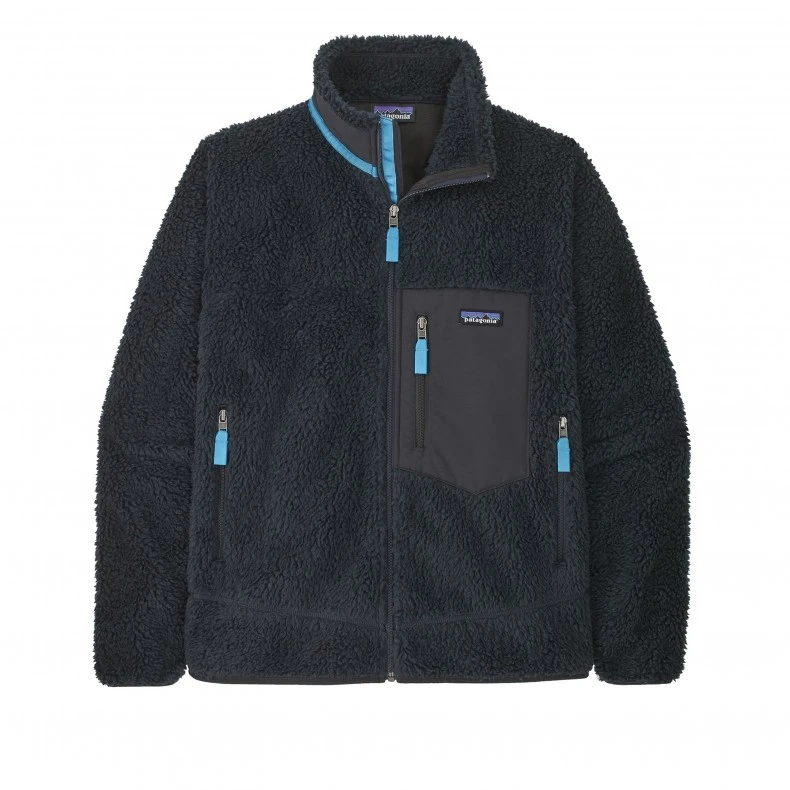 A warm and windproof 100% polyester (50% recycled) bonded sherpa fleece jacket for cool, blustery weather in dark navy blue with black & light baby blue accents. Fair Trade Certifiedâ„¢ sewn.
