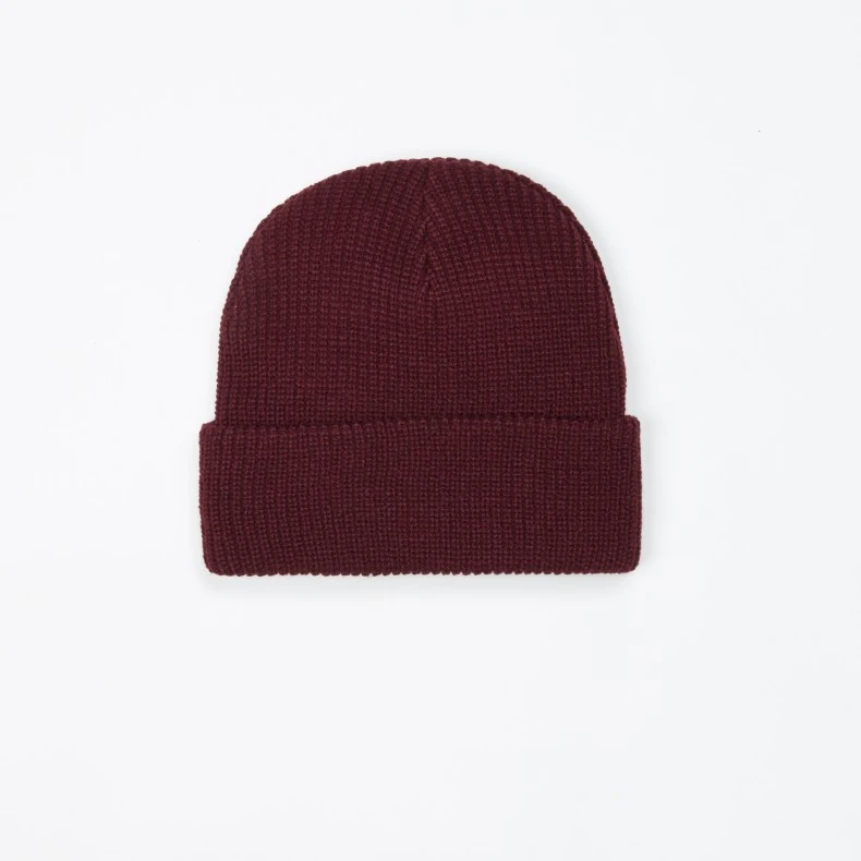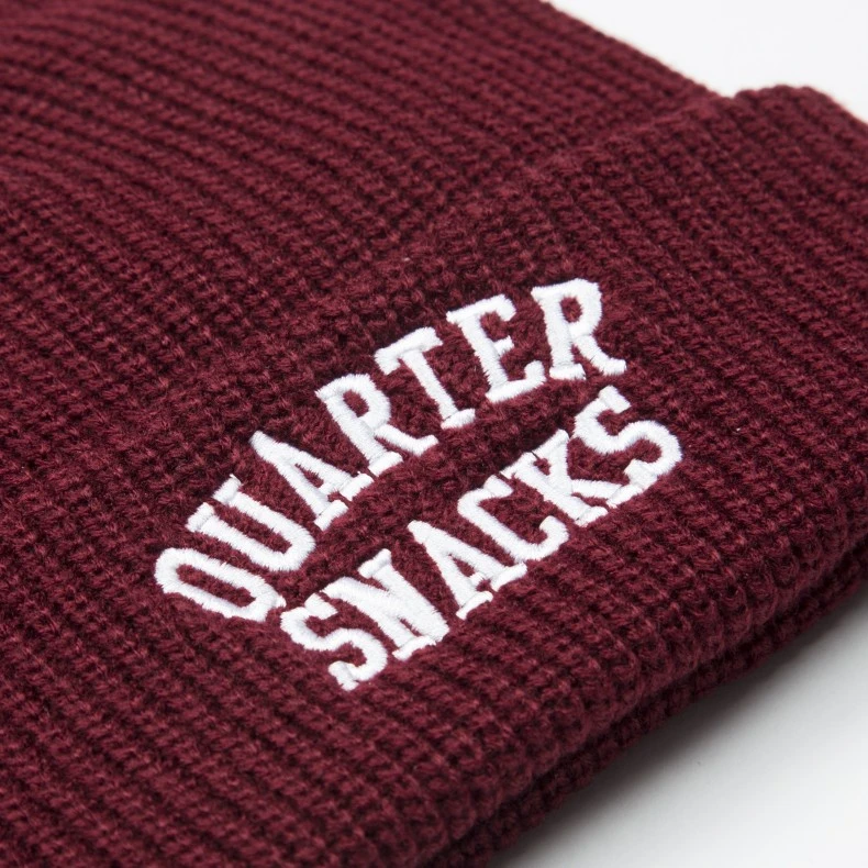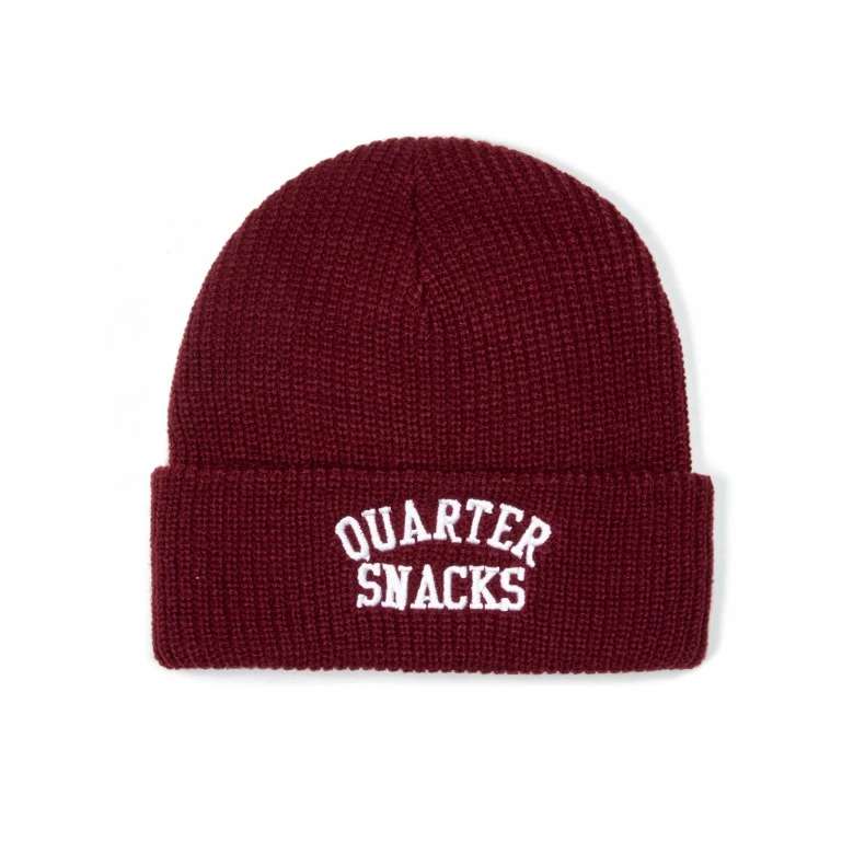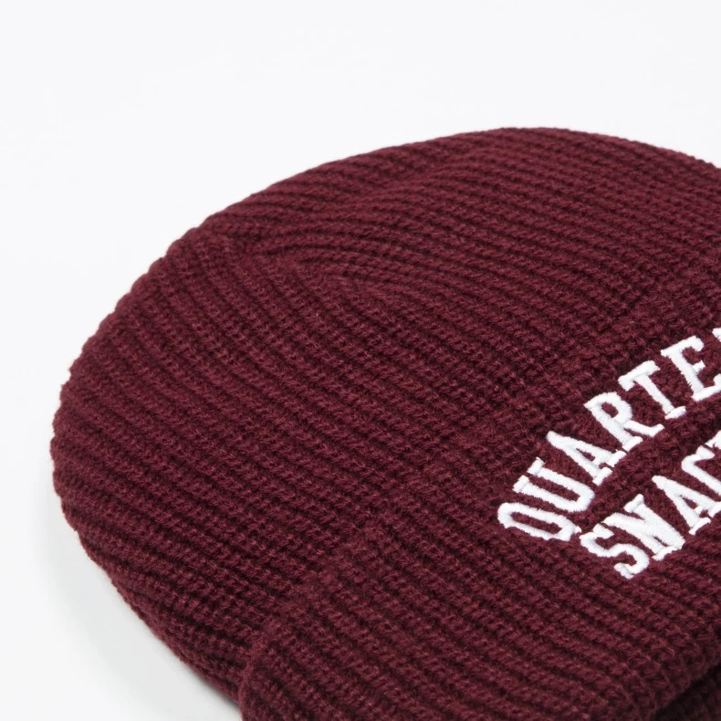 Quartersnacks Arch Beanie, in a burgundy double layer acrylic ribbed knit, featuring a white Quartersnacks Arch embroidery.