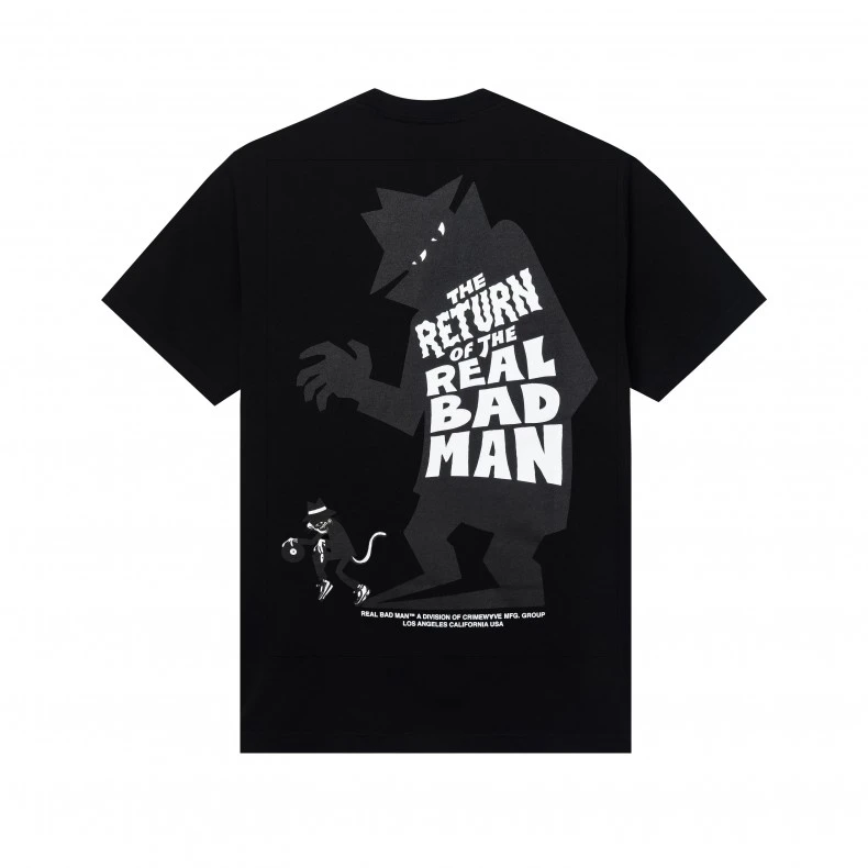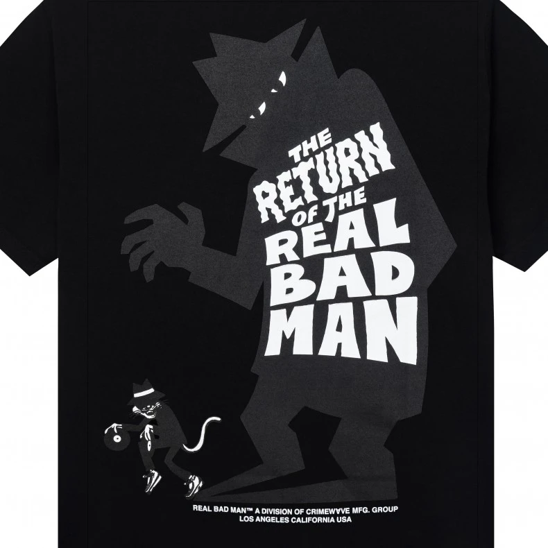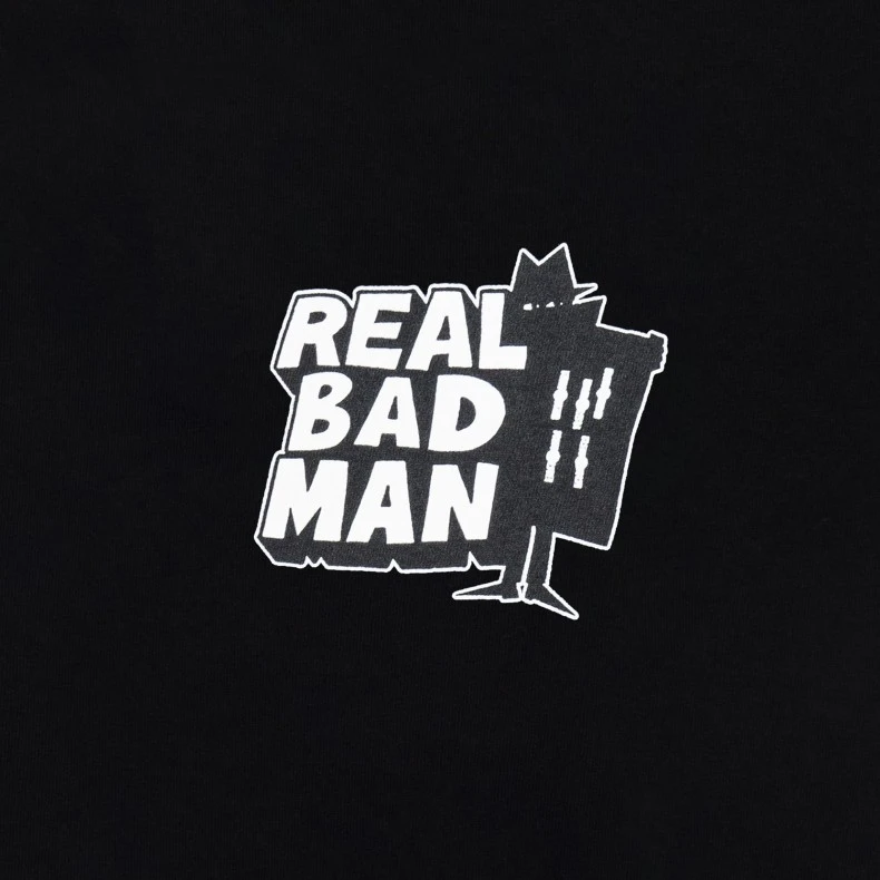 Regular-fit men’s Real Bad Man Return Of The RBM Tee; in a black mid-weight organic cotton jersey, with a ribbed neck, set-in sleeves, and straight hem, featuring large screen printed seasonal graphics on the front and back.