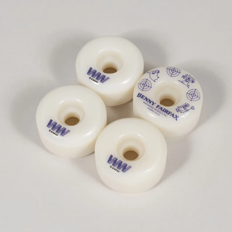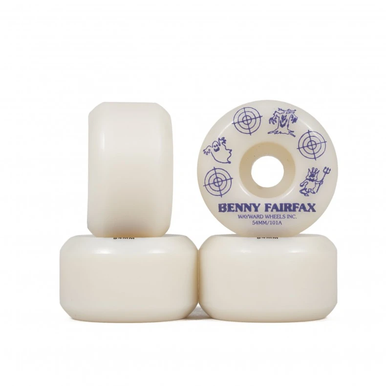 54mm Wayward Wheel Co. Benny Fairfax Funnel Pro Skateboard Wheels in a 101a quality material with a white/purple Benny Fairfax pro graphic.