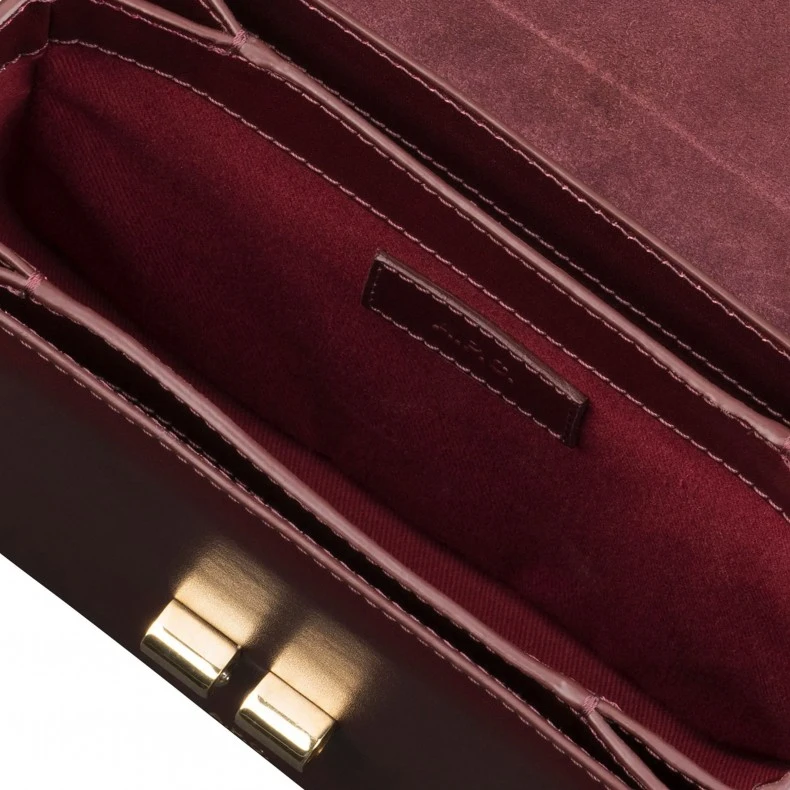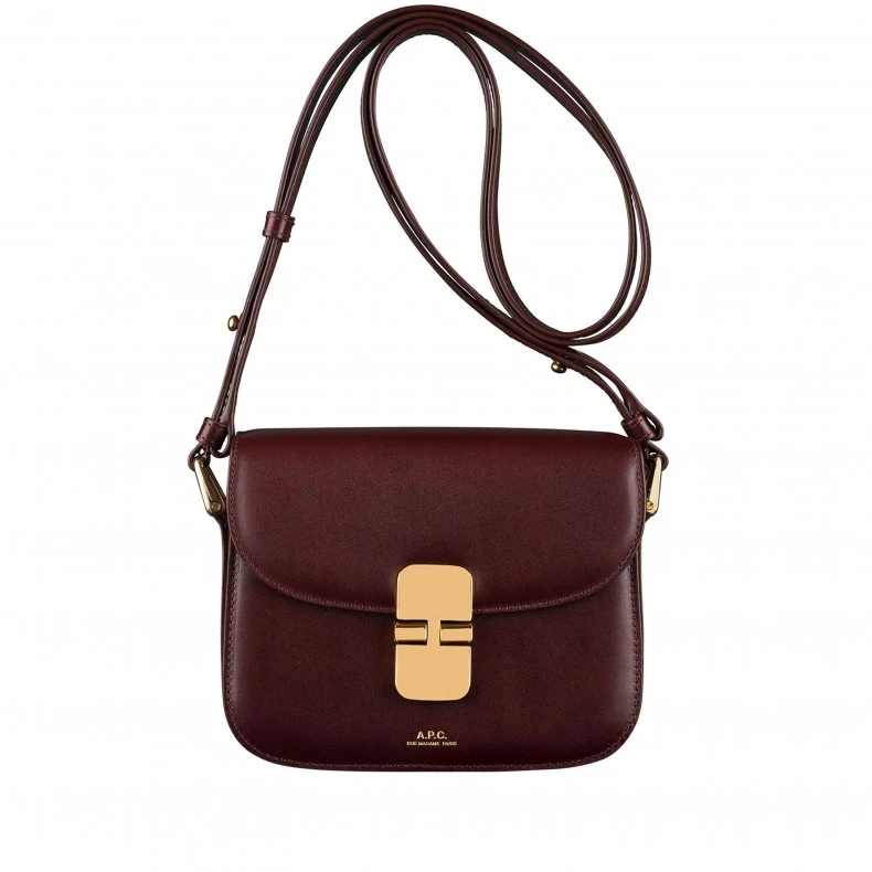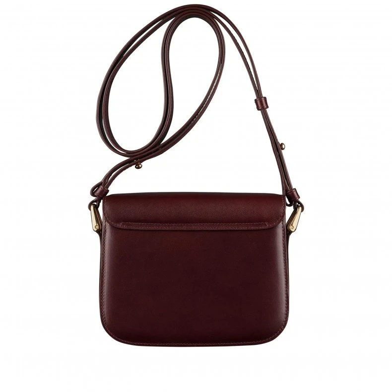 Smooth cowhide leather. Trapezoidal shape. Flap closure with clasp. Calfskin suede lining under flap. Goldtone “A.P.C. Rue Madame Paris” logo embossed on the front. Adjustable shoulder strap. One large compartment and two additional ones. Cotton blend lining. Goldtone hardware. May be carried on the shoulder or across the chest. Dimensions: 21.5 x 17 x 5 cm.