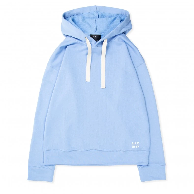 Regular fit women’s A.P.C. Lyn Pullover Hooded Sweatshirt; in a light blue cotton fleece jersey, with a jersey-lined hood, cord adjusters, set-in sleeves, flat contrasting herringbone drawstring, and featuring a contrasting “A.P.C. 19-87” logo printed on the front bottom of the hoodie.
