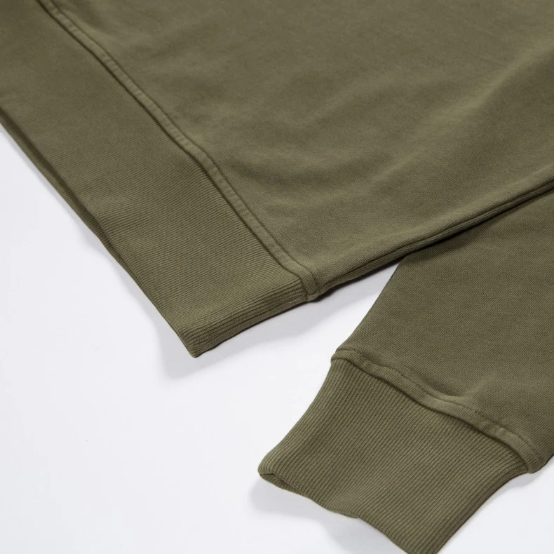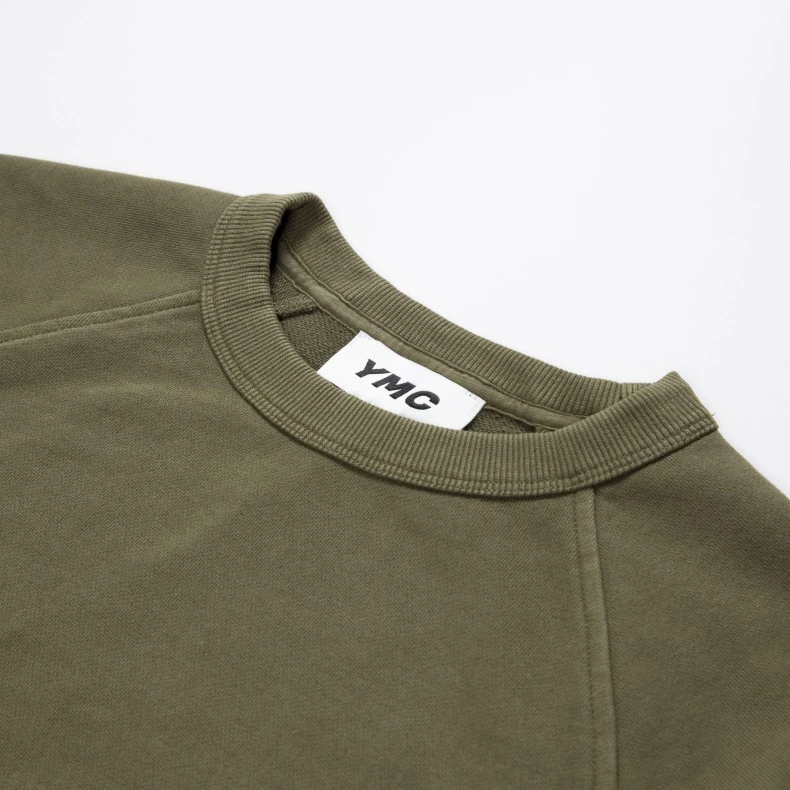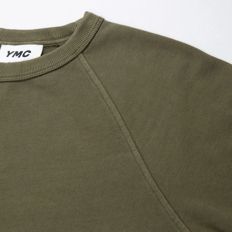 Signature YMC Schrank Cotton Loopback Crew Neck Sweat in a lightweight pigment garment-dyed dark olive green loopback cotton with raglan sleeves with armholes, ribbed cuffs, and waistband for an authentic vintage finish.